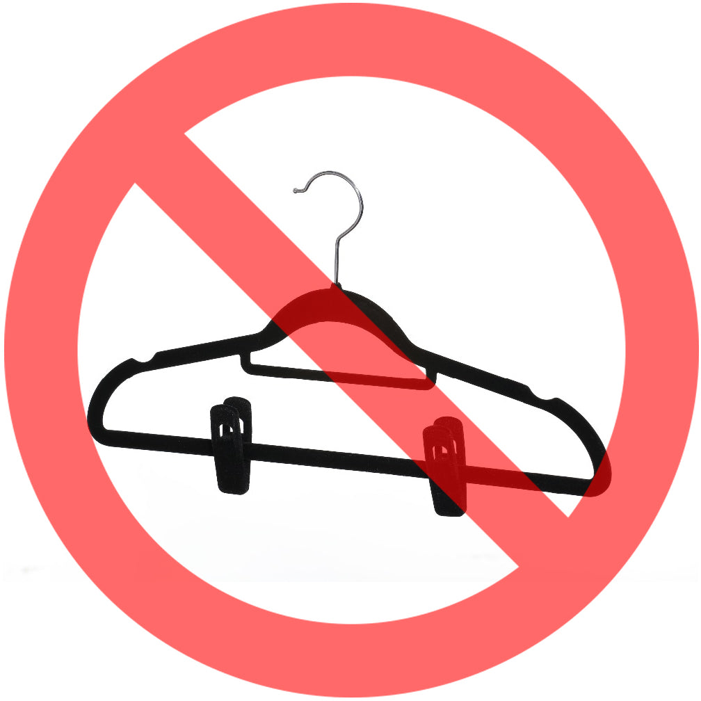 These black flocked skirt hangers are designed to securely hold skirts without leaving marks or indentations. The smooth, non-slip clips contain no interior teeth, making them ideal for delicate fabrics such as leather, suede, or sequined skirts.